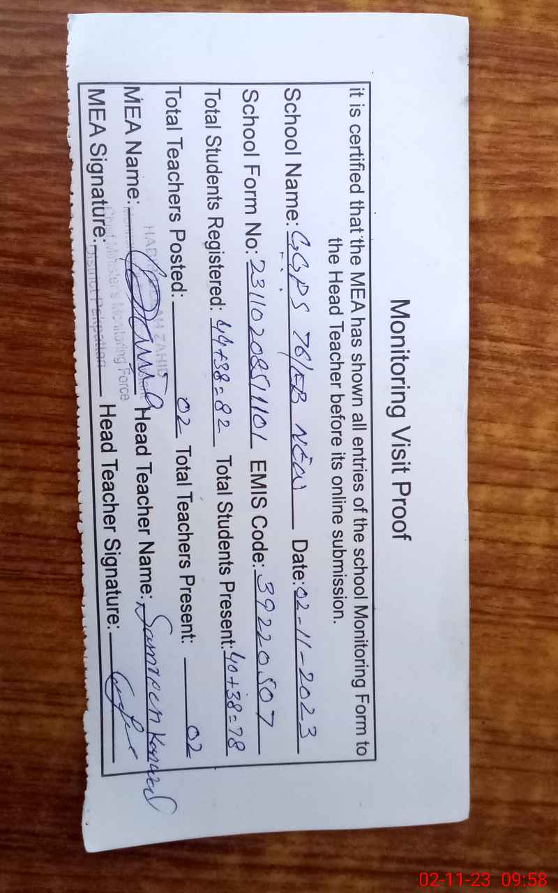 | EMIS Code: 39220507 | Name of School: GGPS CHAK NO. 76/EB (NEW) | |||