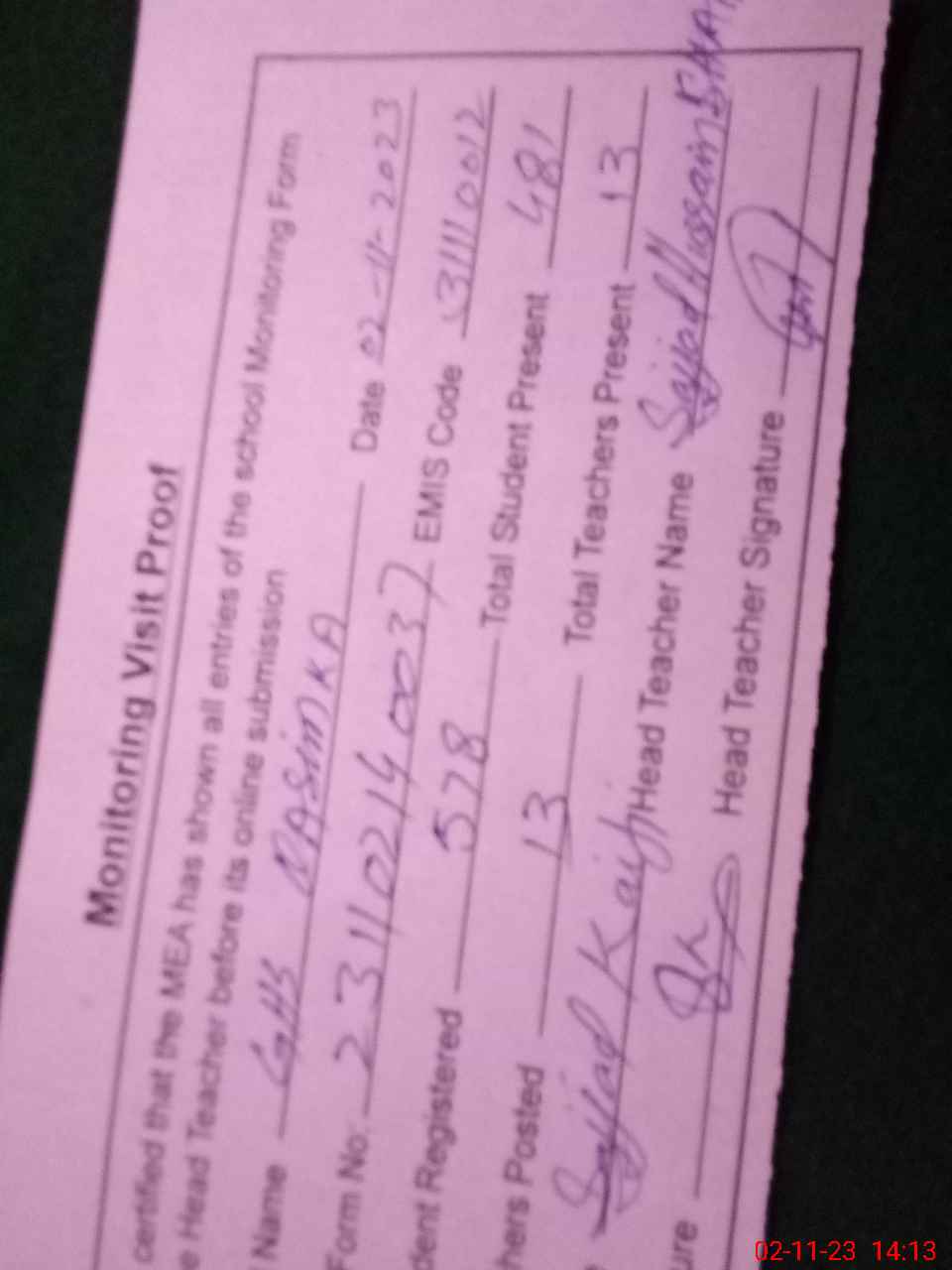 | Attendance Register | Head Teacher | MEA with School | Visit Proof |
