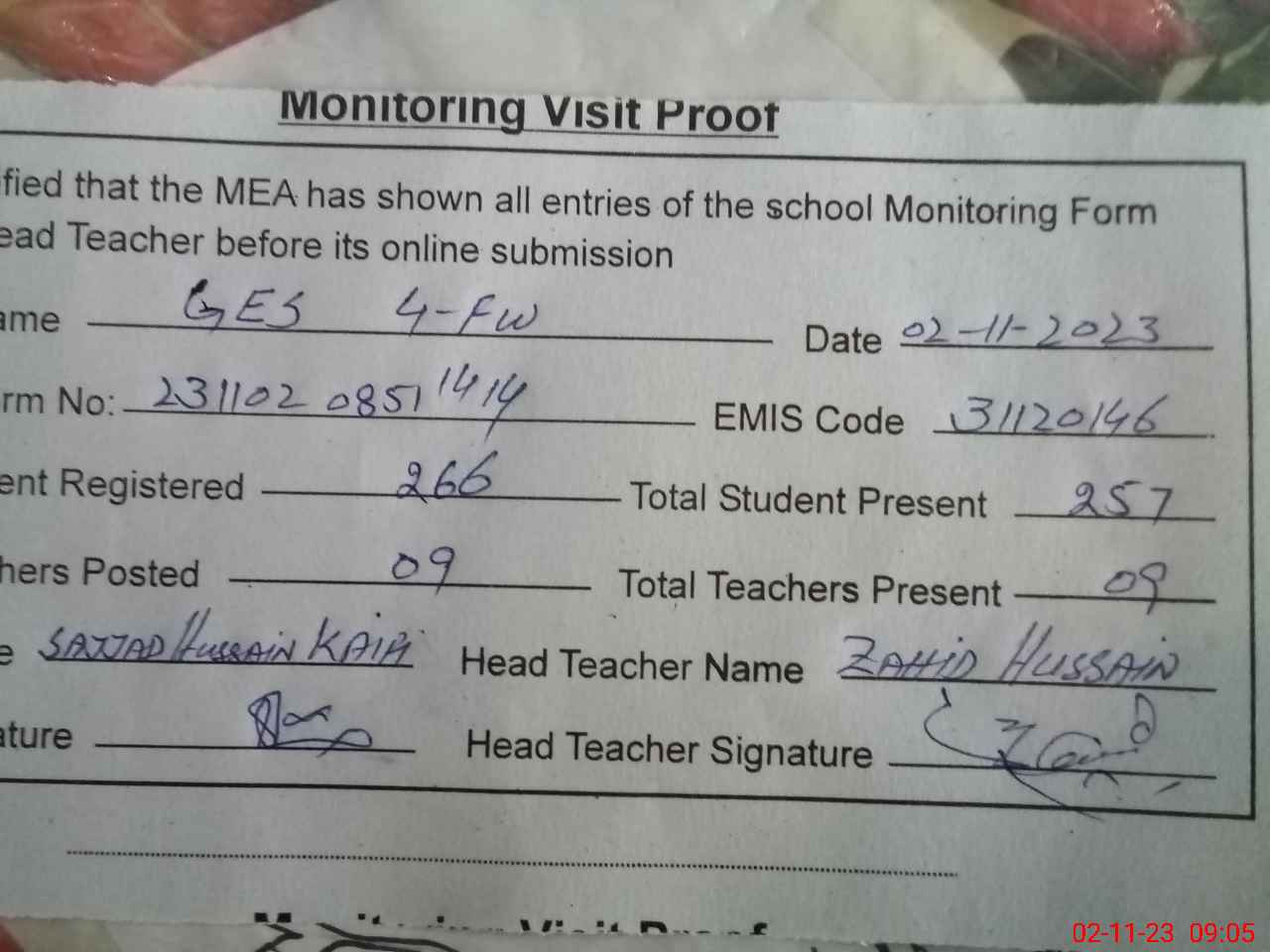 | Attendance Register | Head Teacher | MEA with School | Visit Proof |