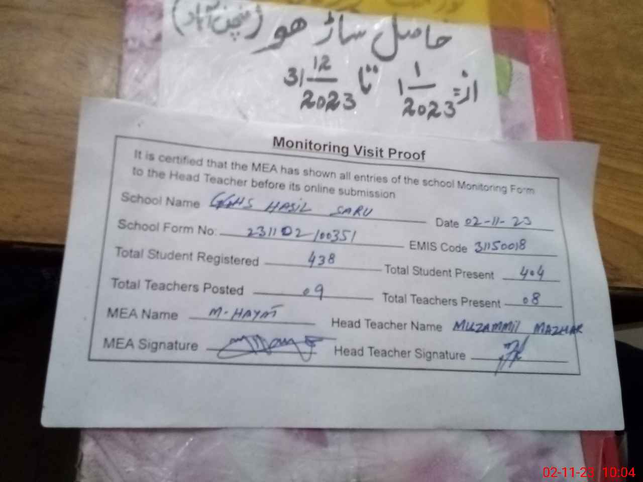 | EMIS Code: 31150018 | Name of School: GGHS HASIL SARU | |||
