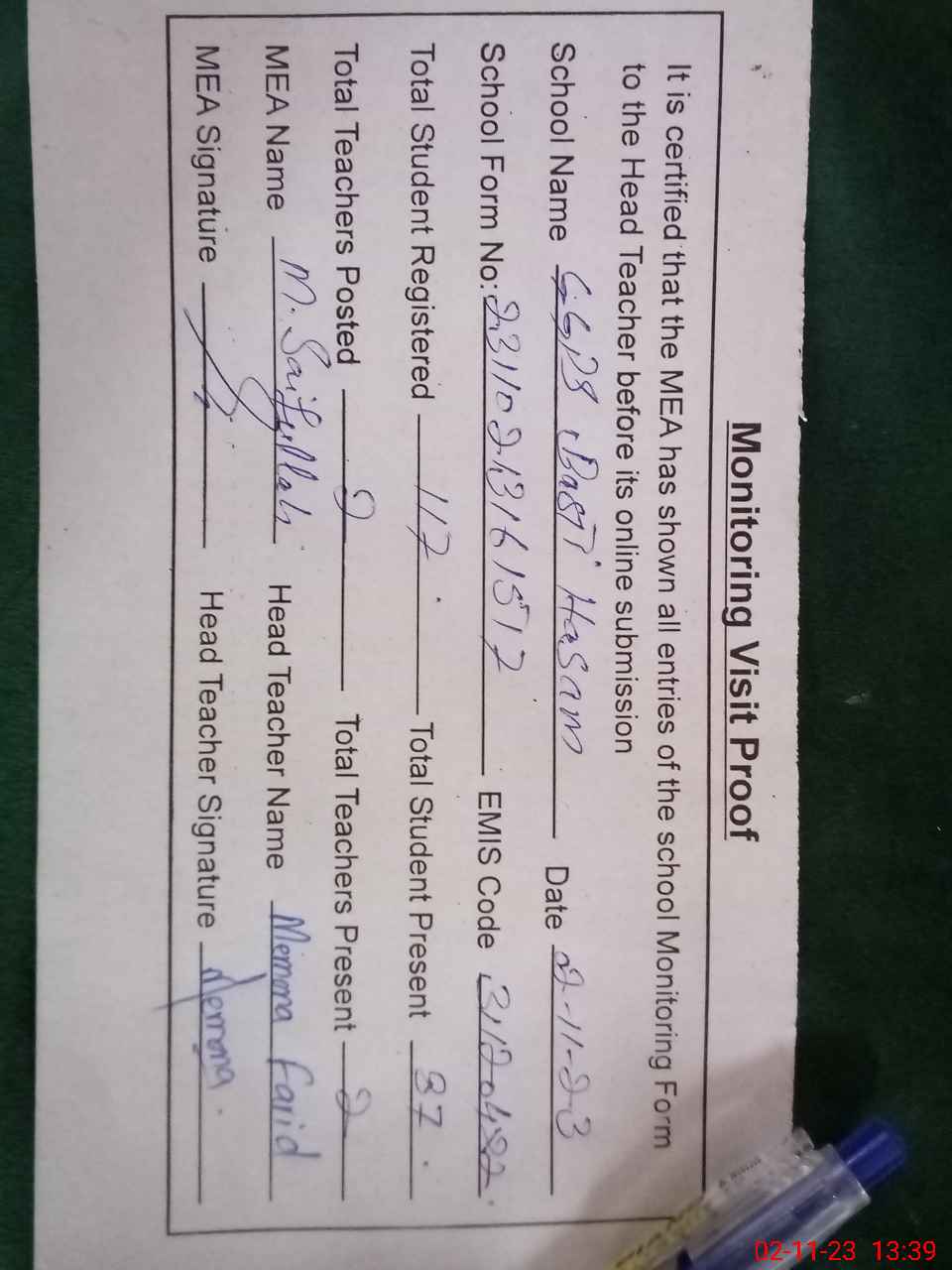 | Attendance Register | Head Teacher | MEA with School | Visit Proof |