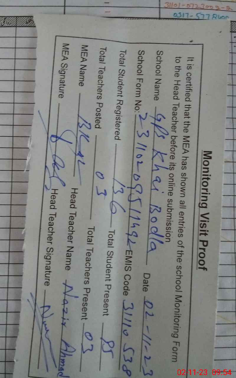 | Attendance Register | Head Teacher | MEA with School | Visit Proof |