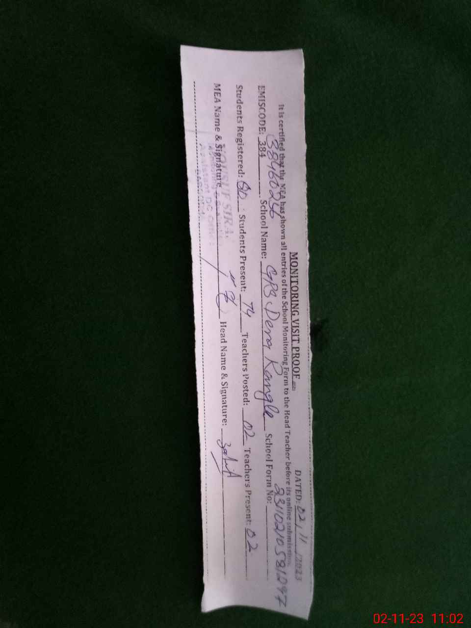 | Attendance Register | Head Teacher | MEA with School | Visit Proof |