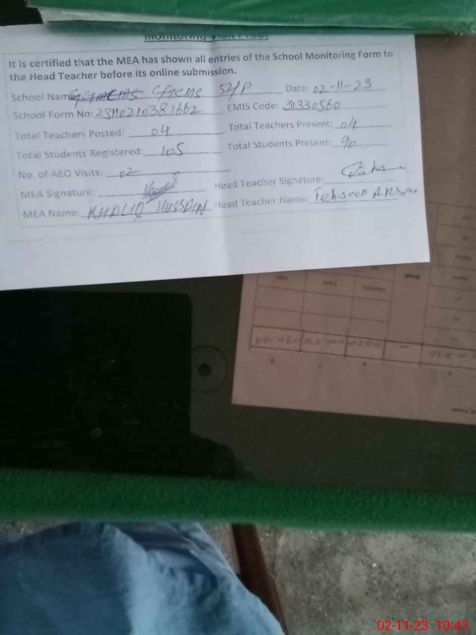 | Attendance Register | Head Teacher | MEA with School | Visit Proof |