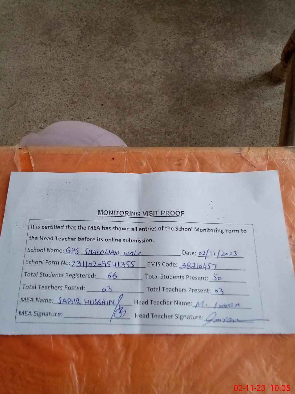 | Attendance Register | Head Teacher | MEA with School | Visit Proof |