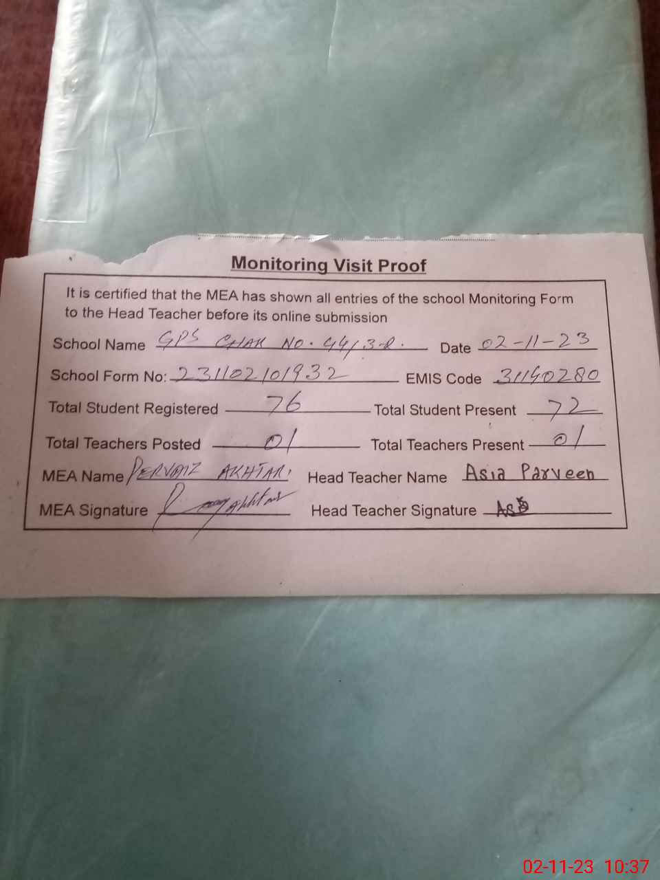 | Attendance Register | Head Teacher | MEA with School | Visit Proof |