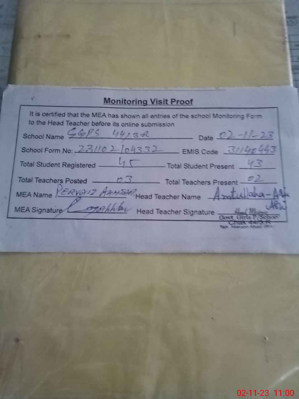 | Attendance Register | Head Teacher | MEA with School | Visit Proof |