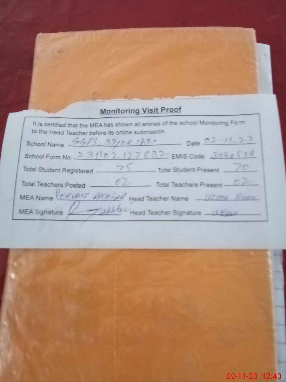 | Attendance Register | Head Teacher | MEA with School | Visit Proof |