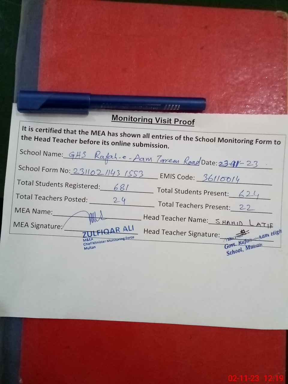 | Attendance Register | Head Teacher | MEA with School | Visit Proof |