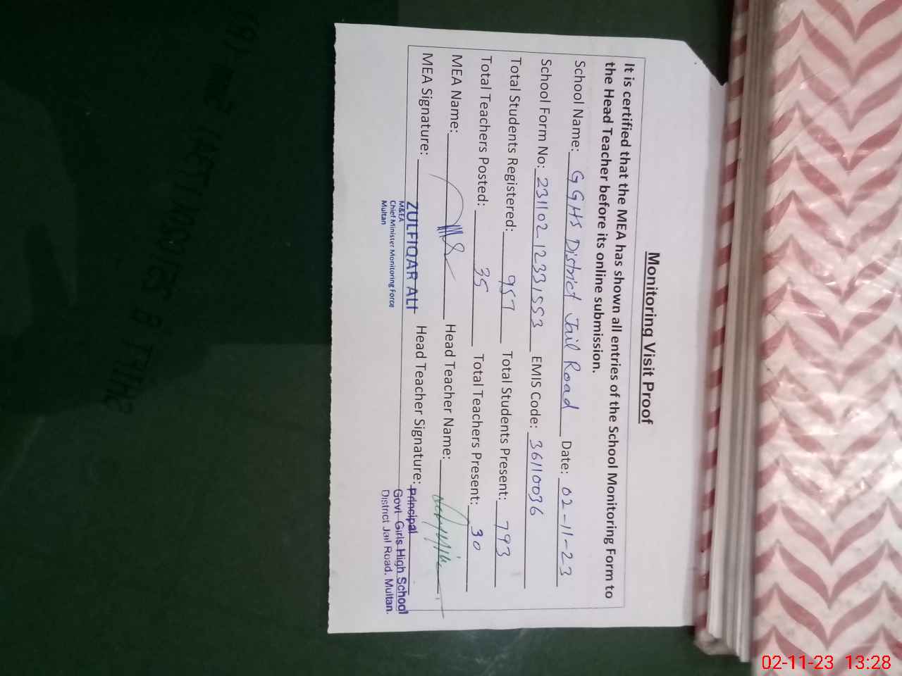 | EMIS Code: 36110036 | Name of School: GGHS DISTRICT JAIL ROAD MULTAN | |||
