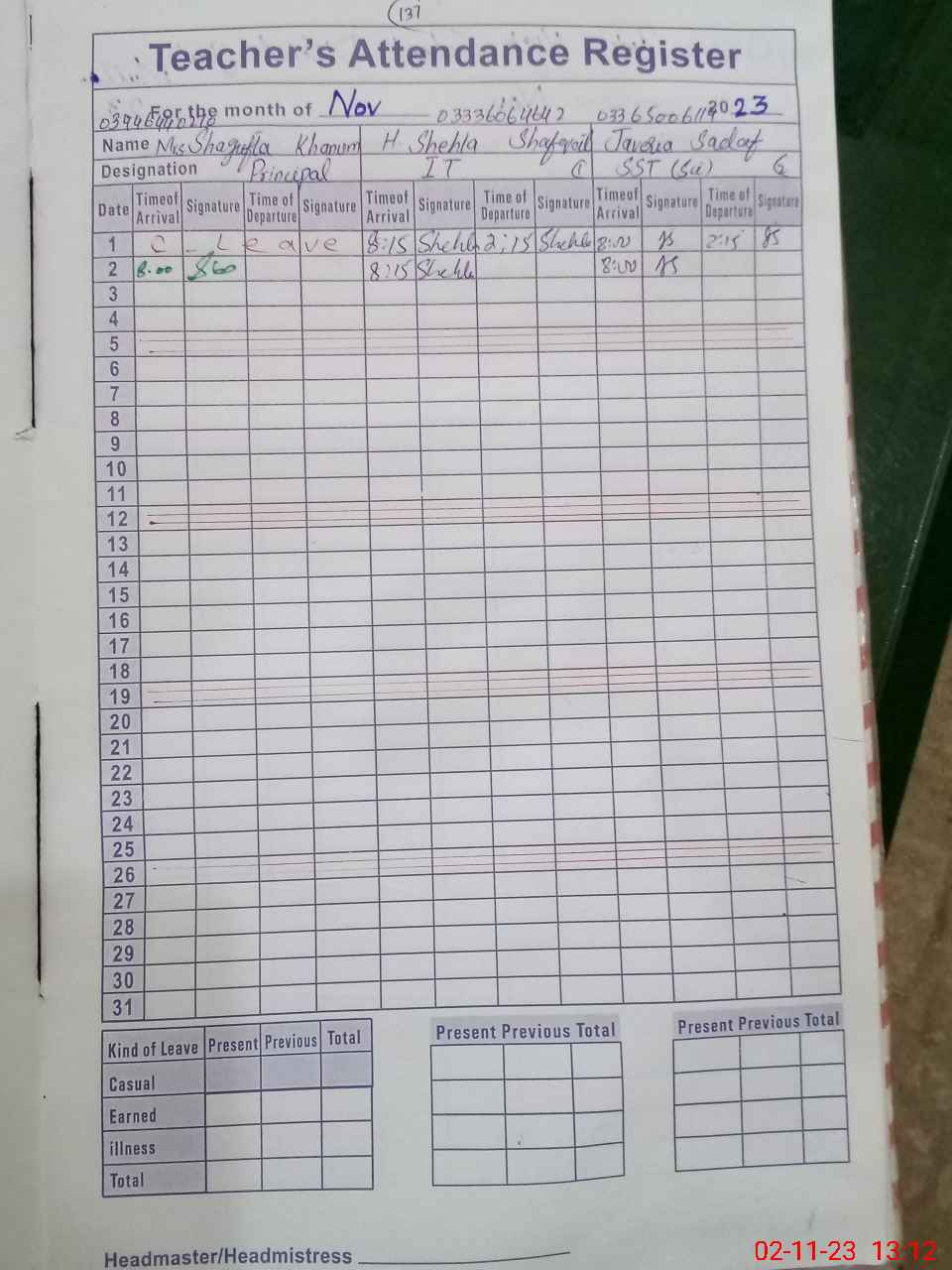 | Name: Az**** Ja**** Designation: (School Headmaster's/Headmistress's) Incharge Head Teacher Phone/Cell Number: 03**** |