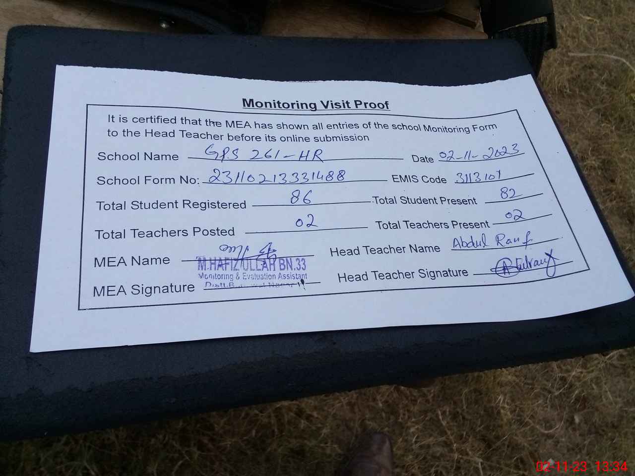 | Attendance Register | Head Teacher | MEA with School | Visit Proof |