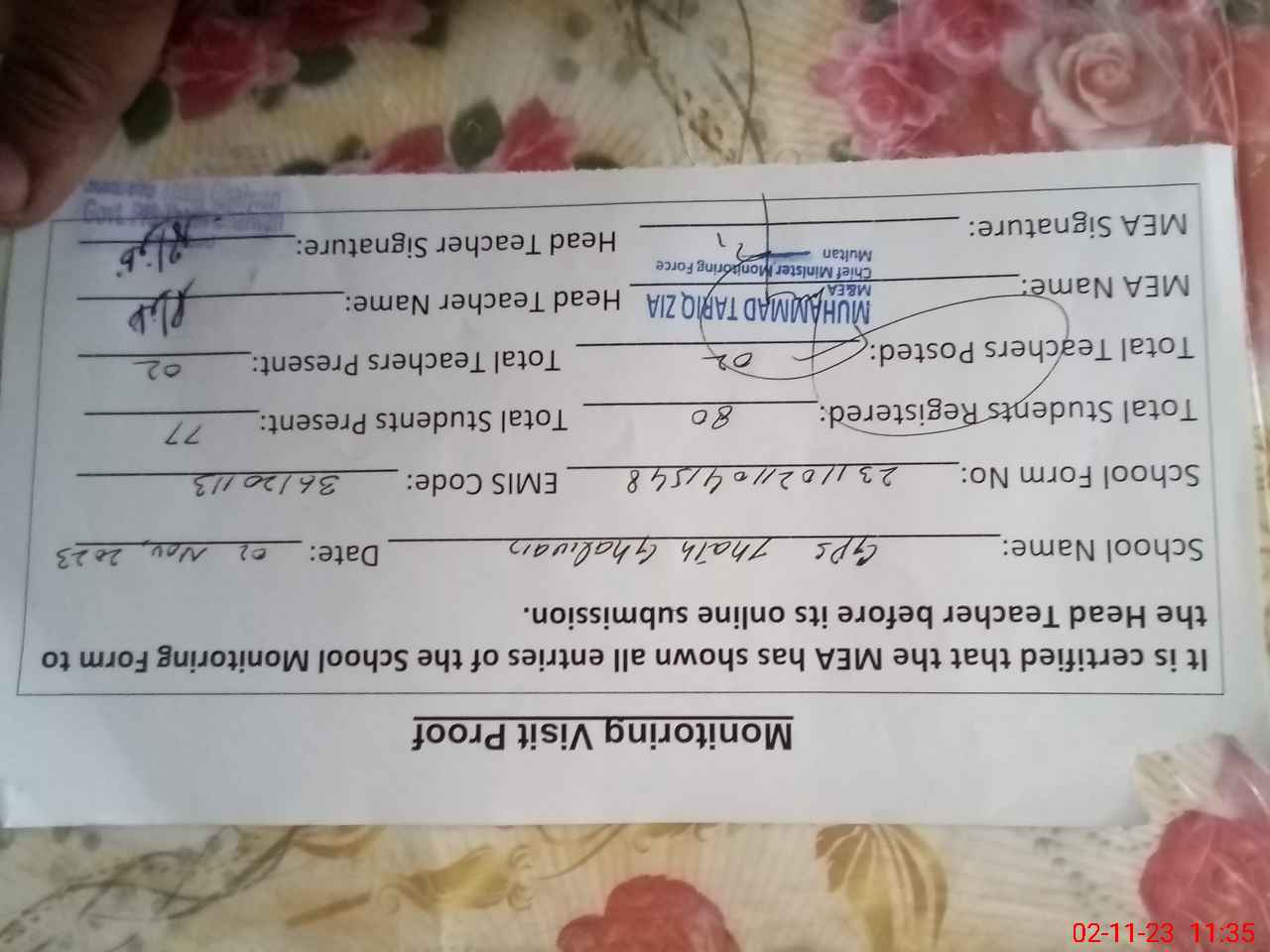 | Monitoring Date: 02-11-2023 | Start Time: 02-11-2023 11:04 AM | End Time: 02-11-2023 11:35 AM | Name of MEA: Mu**** Ta**** Zi**** | |