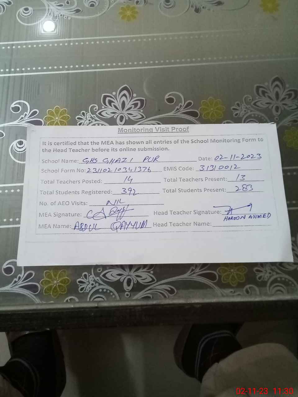 | EMIS Code: 31310012 | Name of School: GHS GHAZI PUR | |||