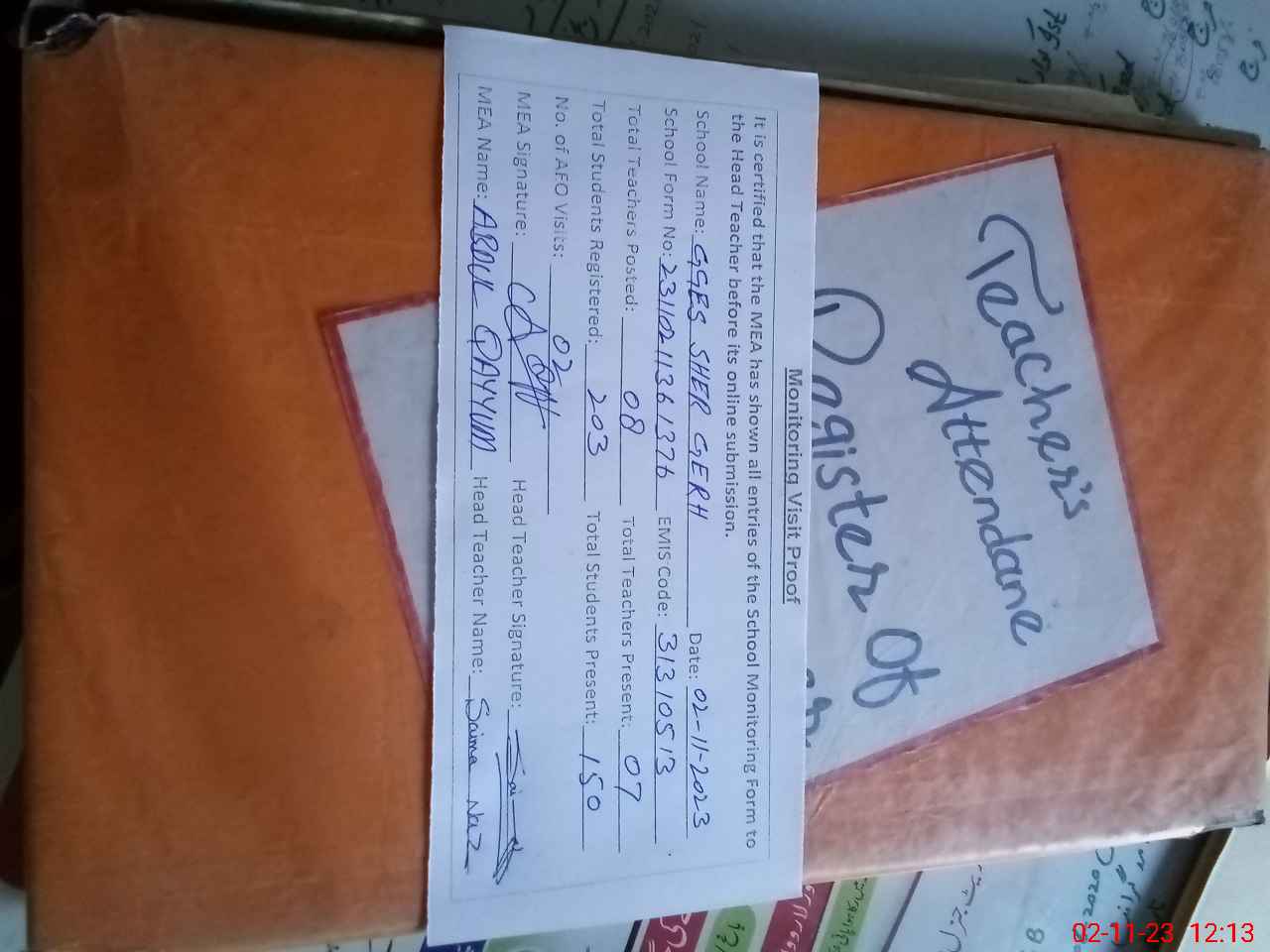 | Attendance Register | Head Teacher | MEA with School | Visit Proof |