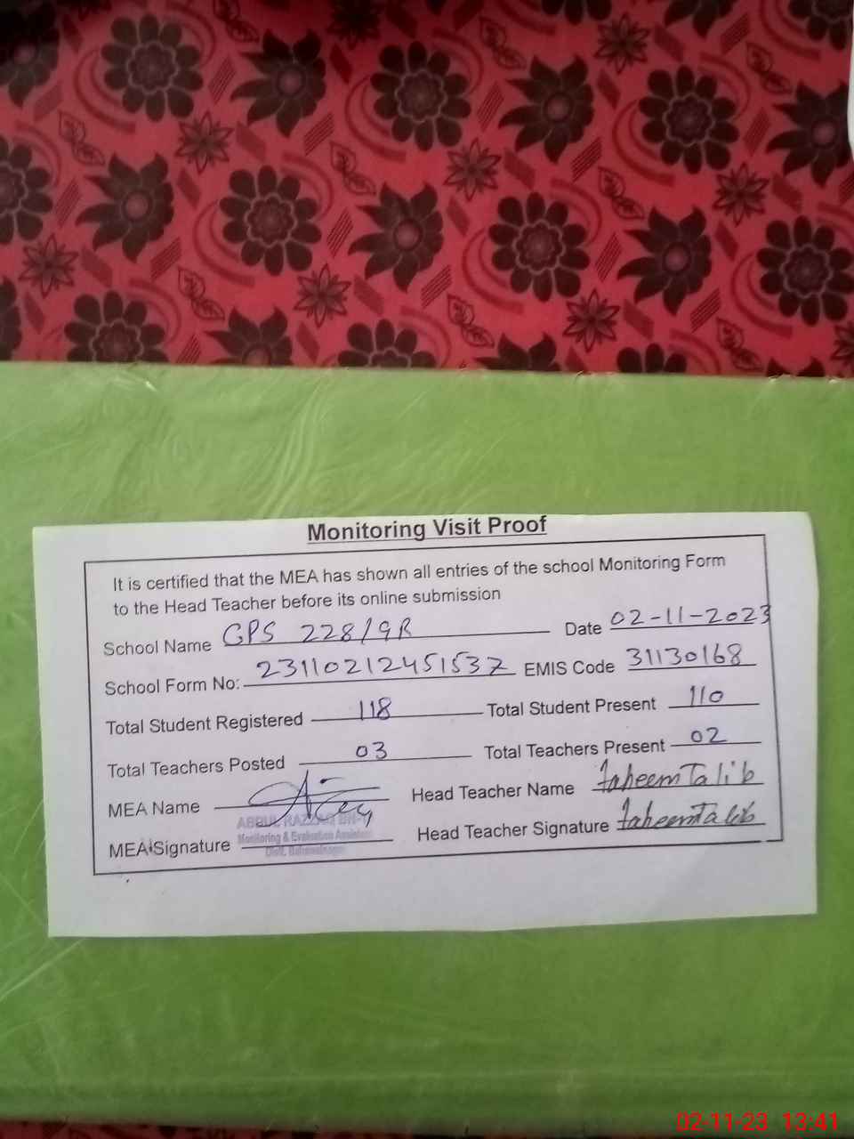 | Attendance Register | Head Teacher | MEA with School | Visit Proof |