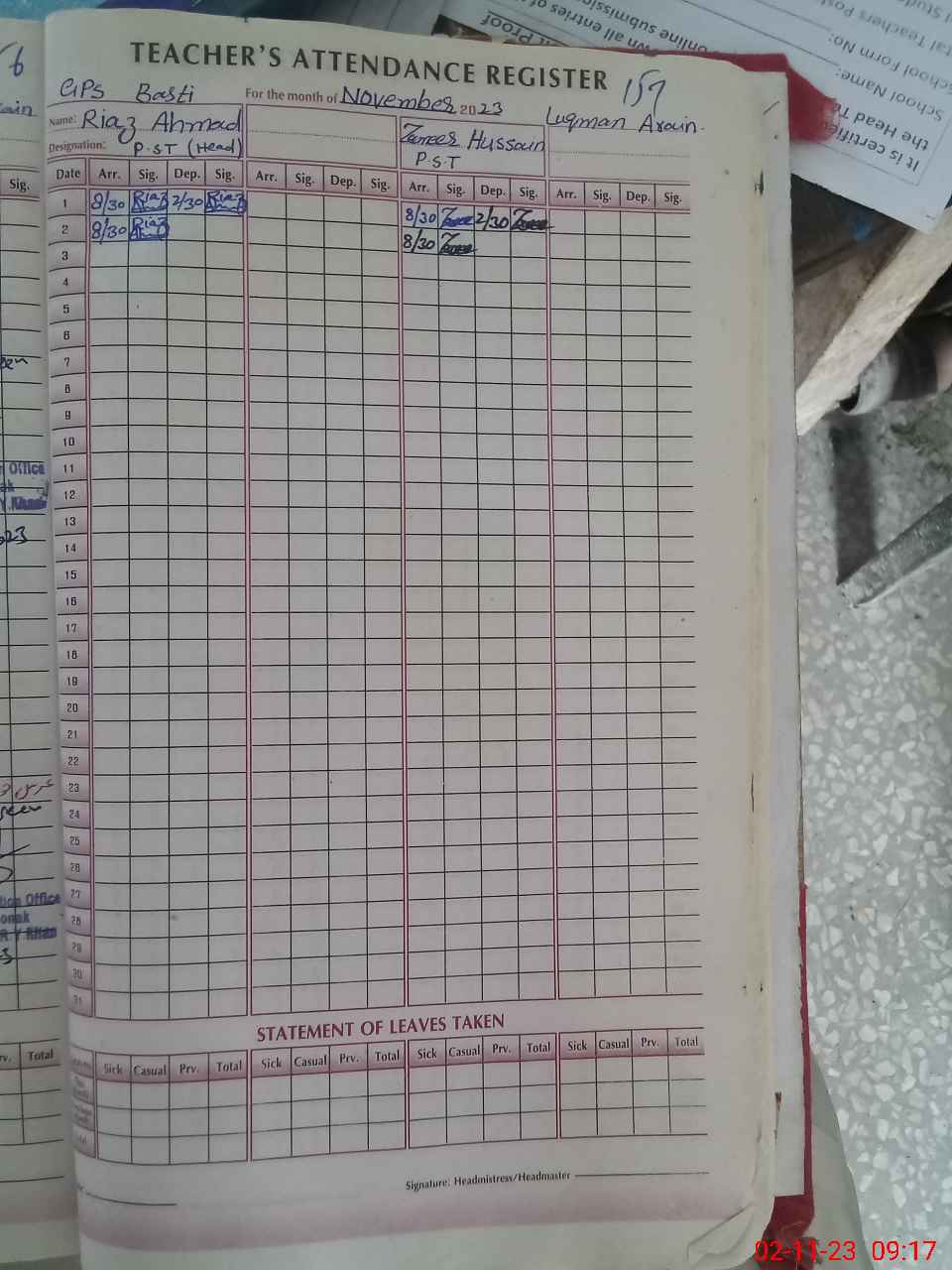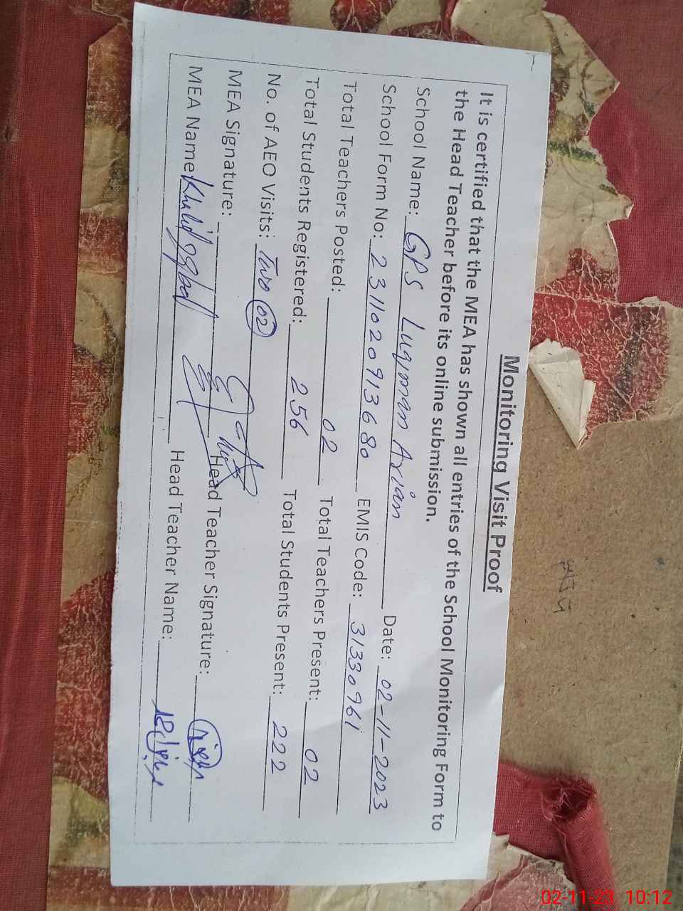 | Attendance Register | Head Teacher | MEA with School | Visit Proof |