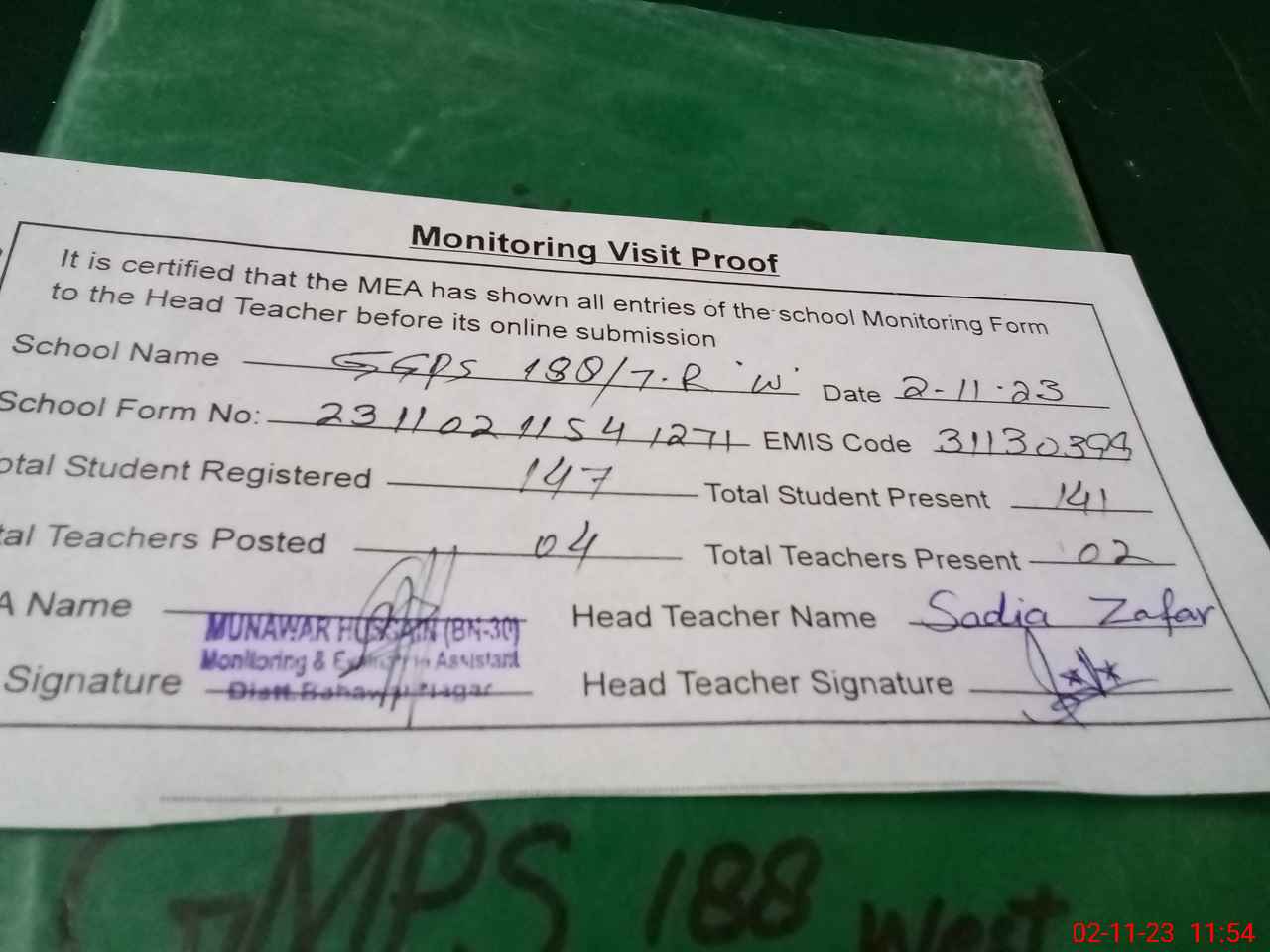 | Attendance Register | Head Teacher | MEA with School | Visit Proof |