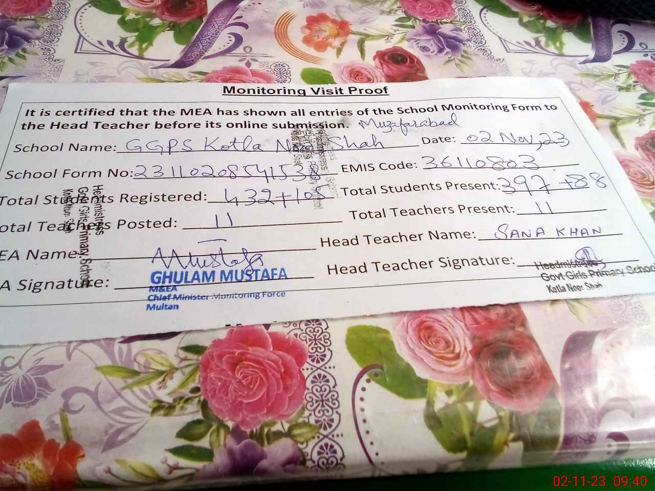 | Monitoring Date: 02-11-2023 | Start Time: 02-11-2023 08:54 AM | End Time: 02-11-2023 09:43 AM | Name of MEA: Gh**** Mu**** | |