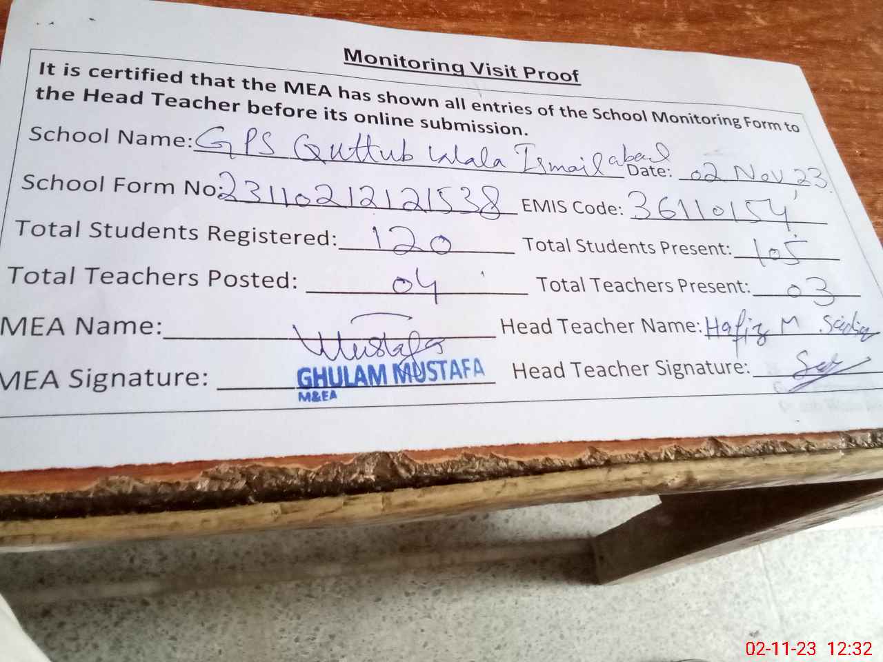 | Attendance Register | Head Teacher | MEA with School | Visit Proof |