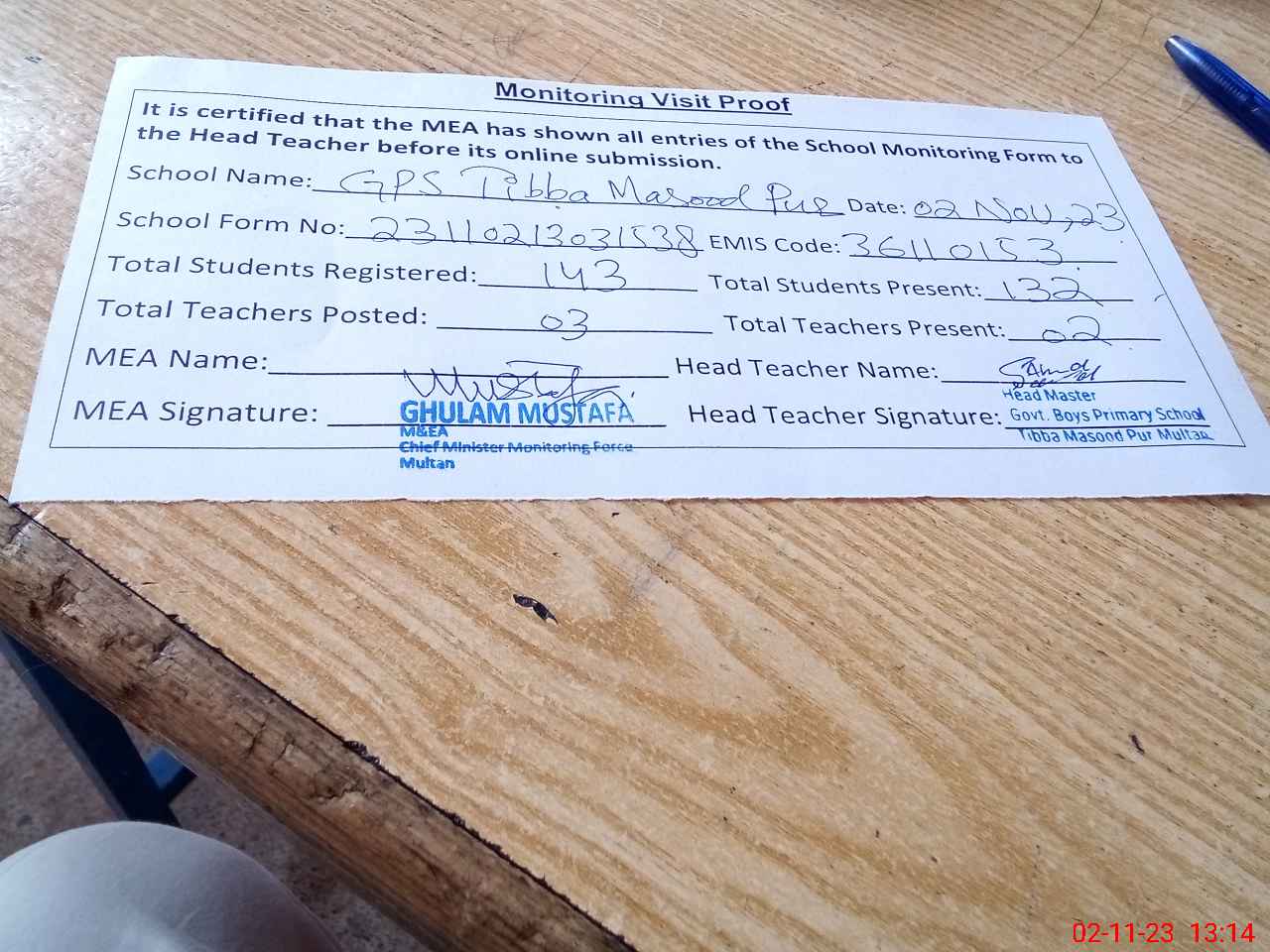 | Monitoring Date: 02-11-2023 | Start Time: 02-11-2023 01:02 PM | End Time: 02-11-2023 01:30 PM | Name of MEA: Gh**** Mu**** | |