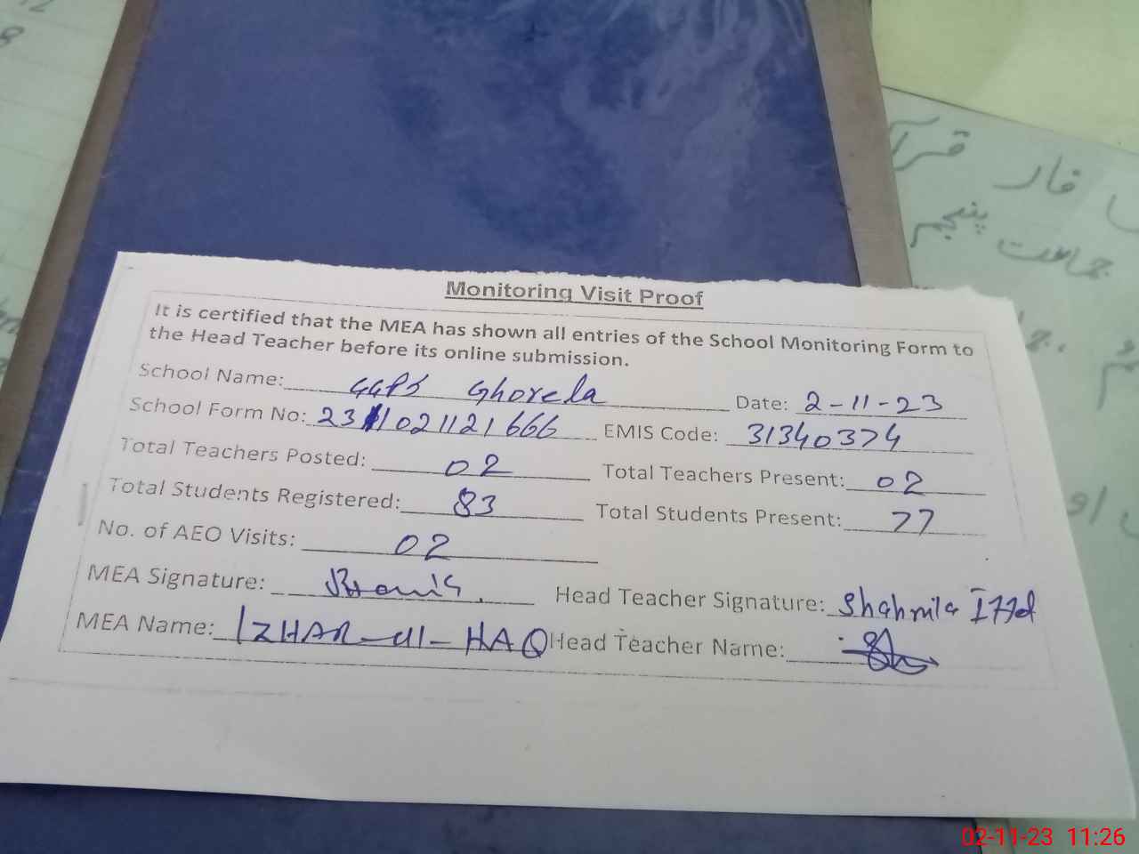 | Attendance Register | Head Teacher | MEA with School | Visit Proof |