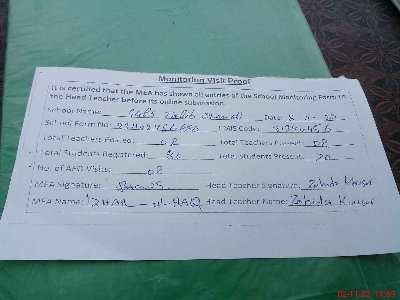 | Attendance Register | Head Teacher | MEA with School | Visit Proof |