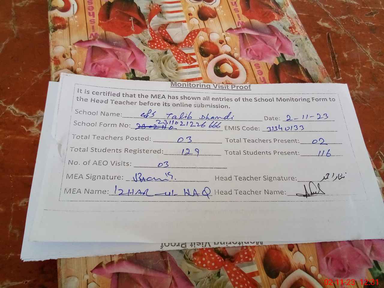 | EMIS Code: 31340133 | Name of School: GPS TALIB DHANDI | |||