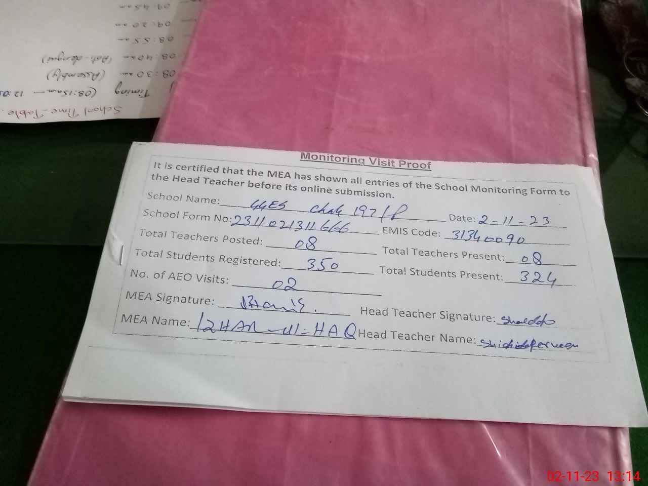 | Attendance Register | Head Teacher | MEA with School | Visit Proof |
