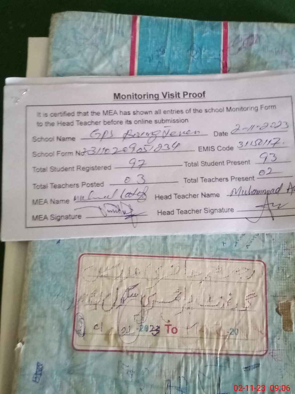 | Attendance Register | Head Teacher | MEA with School | Visit Proof |