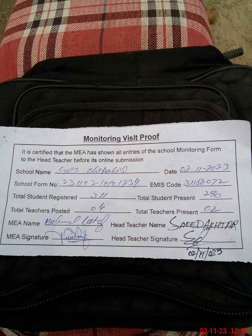 | Attendance Register | Head Teacher | MEA with School | Visit Proof |