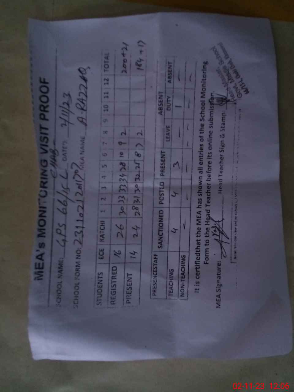 | Attendance Register | Head Teacher | MEA with School | Visit Proof |
