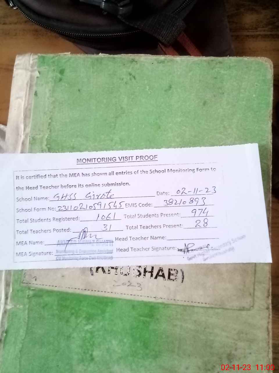 | Attendance Register | Head Teacher | MEA with School | Visit Proof |