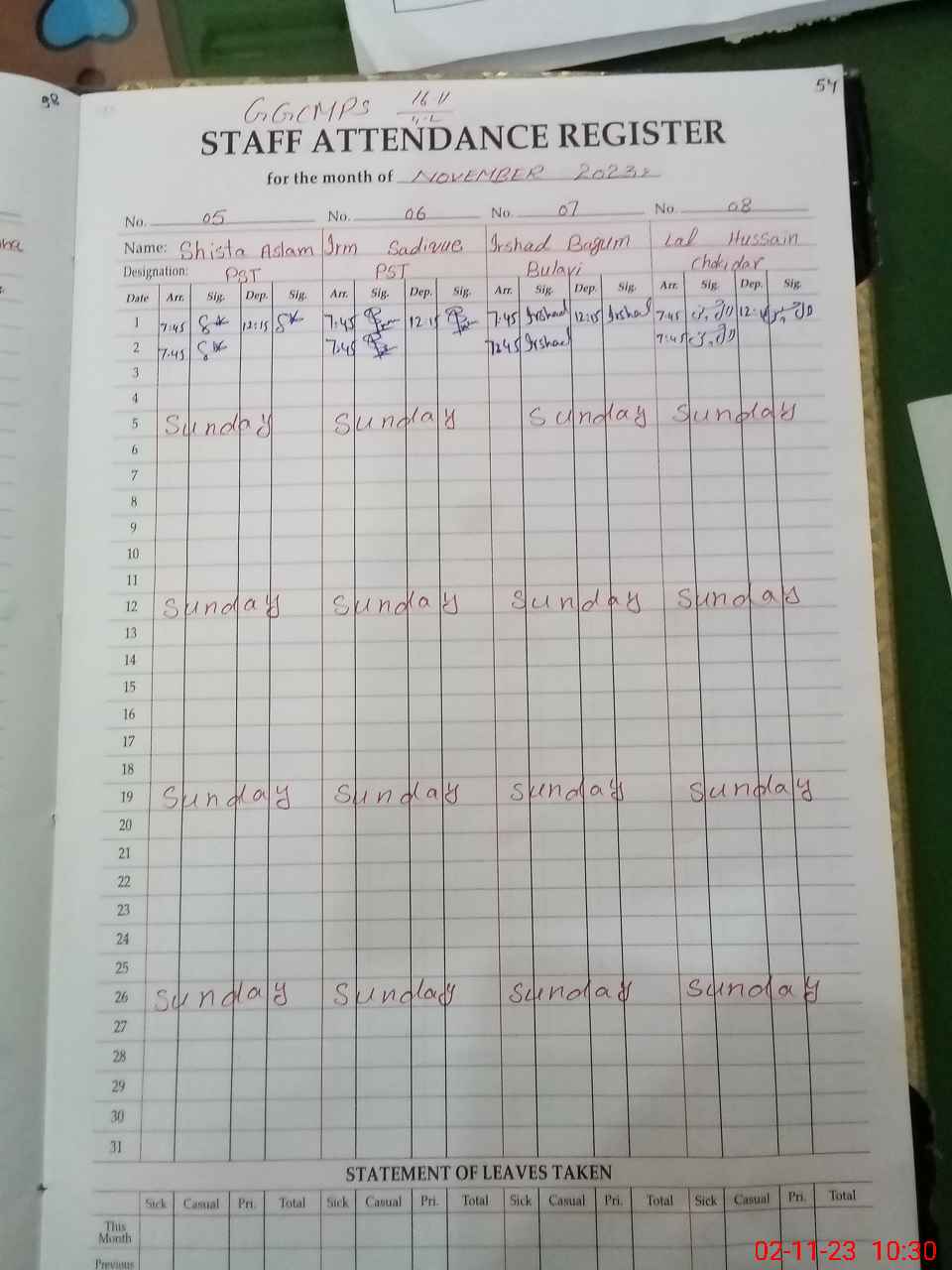 | No. of Students Present - Female | 23 | 0 | 30 | 28 | 30 | 35 | 38 | 43 | 227 | |||||||