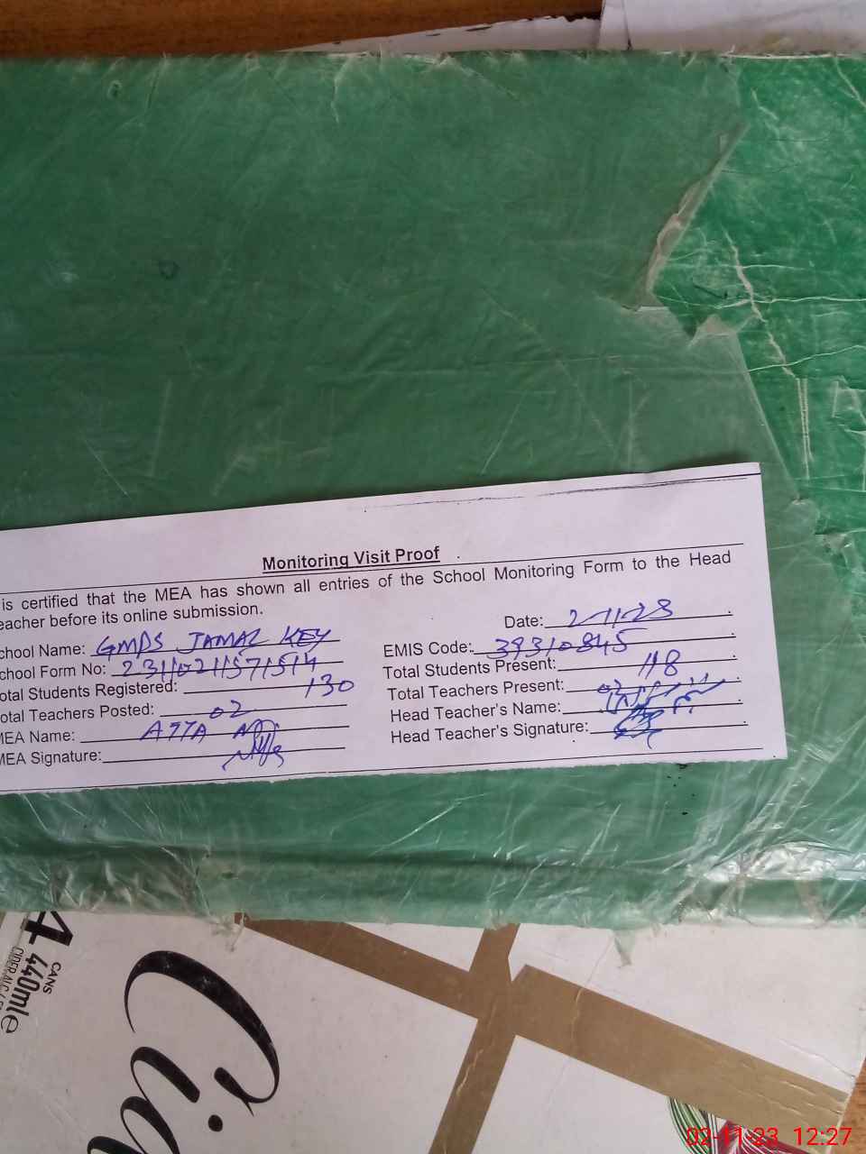 | Attendance Register | Head Teacher | MEA with School | Visit Proof |