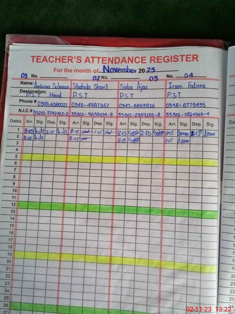 | CNIC | Full Name | Designation | R/C | Absence During Last Calender Month |