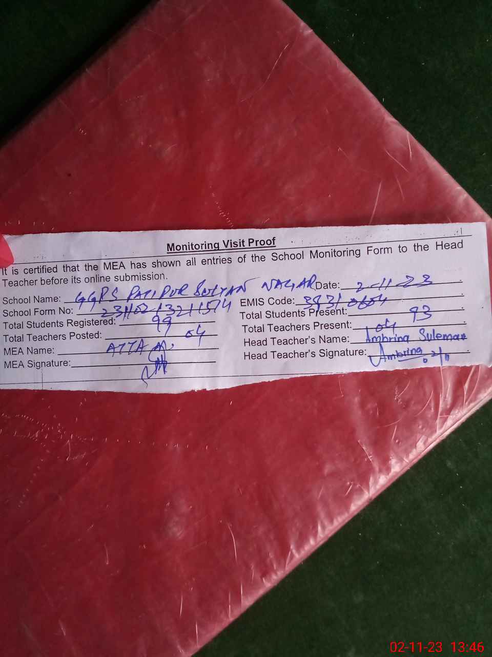 | Attendance Register | Head Teacher | MEA with School | Visit Proof |