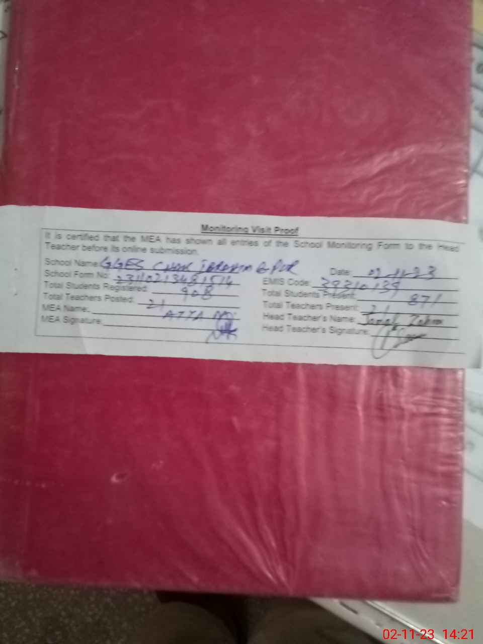 | Attendance Register | Head Teacher | MEA with School | Visit Proof |