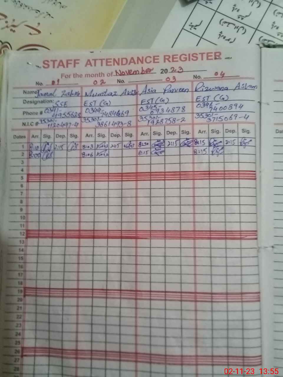 | CNIC | Full Name | Designation | R/C | Absence During Last Calender Month |