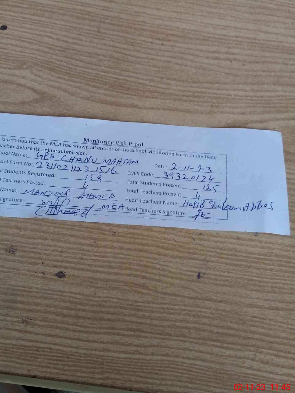 | Attendance Register | Head Teacher | MEA with School | Visit Proof |