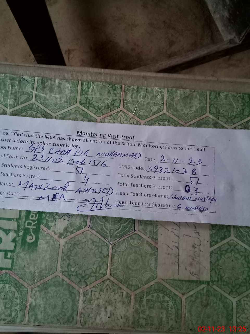 | Attendance Register | Head Teacher | MEA with School | Visit Proof |