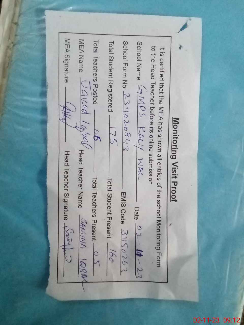 | Attendance Register | Head Teacher | MEA with School | Visit Proof |