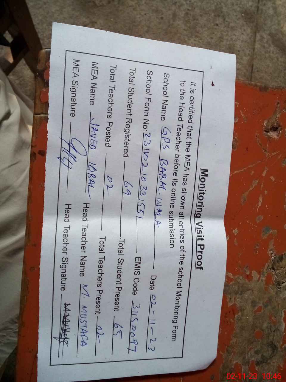 | Attendance Register | Head Teacher | MEA with School | Visit Proof |