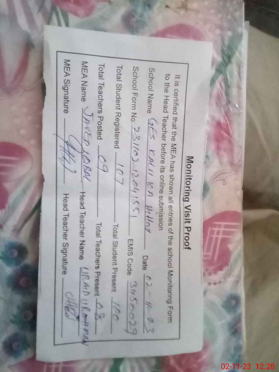 | Attendance Register | Head Teacher | MEA with School | Visit Proof |