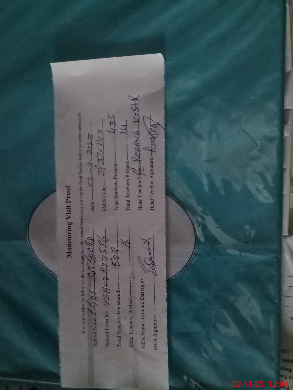 | Attendance Register | Head Teacher | MEA with School | Visit Proof |