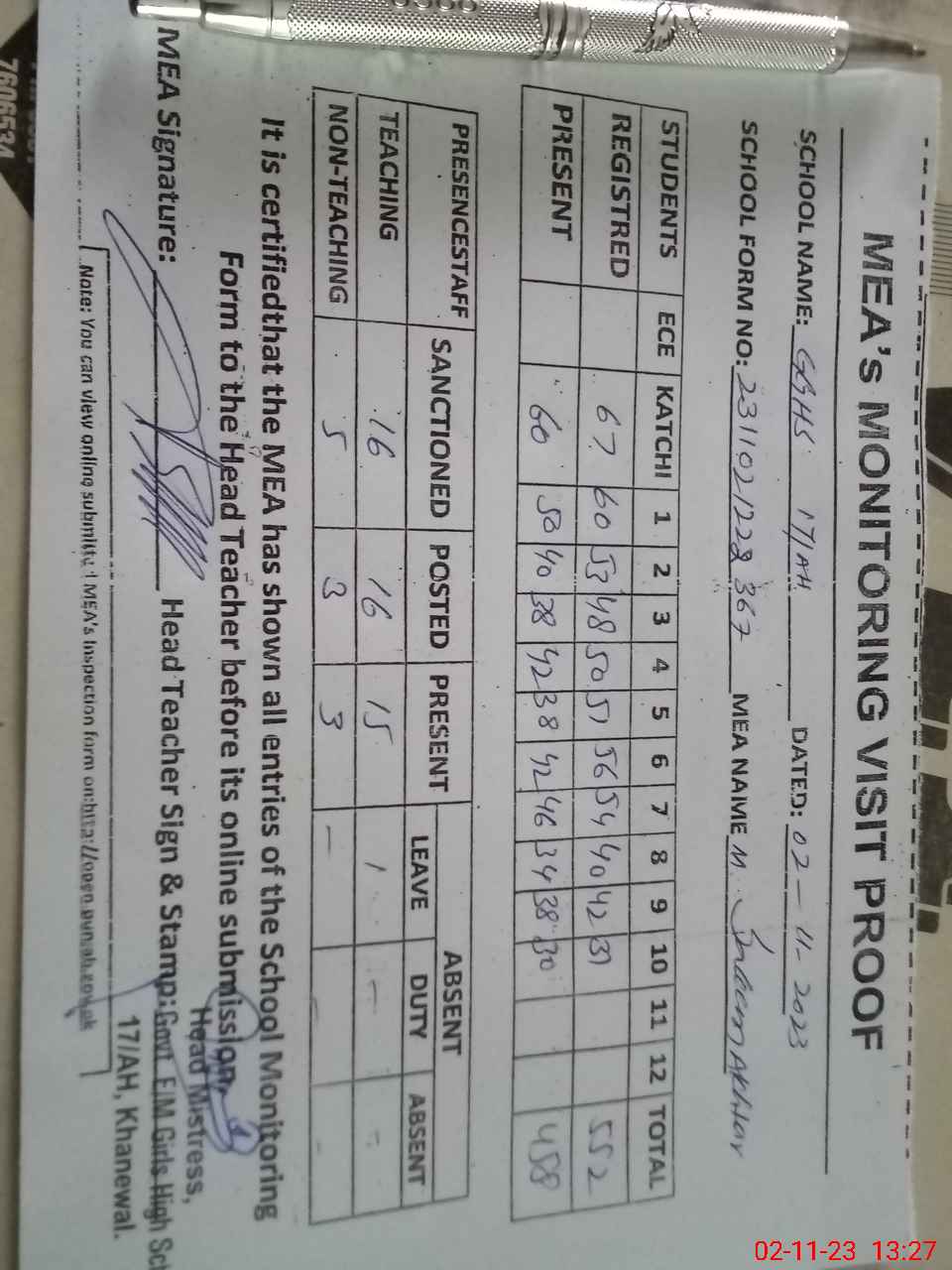| EMIS Code: 36420107 | Name of School: GGHS 17/AH, KHANEWAL | |||