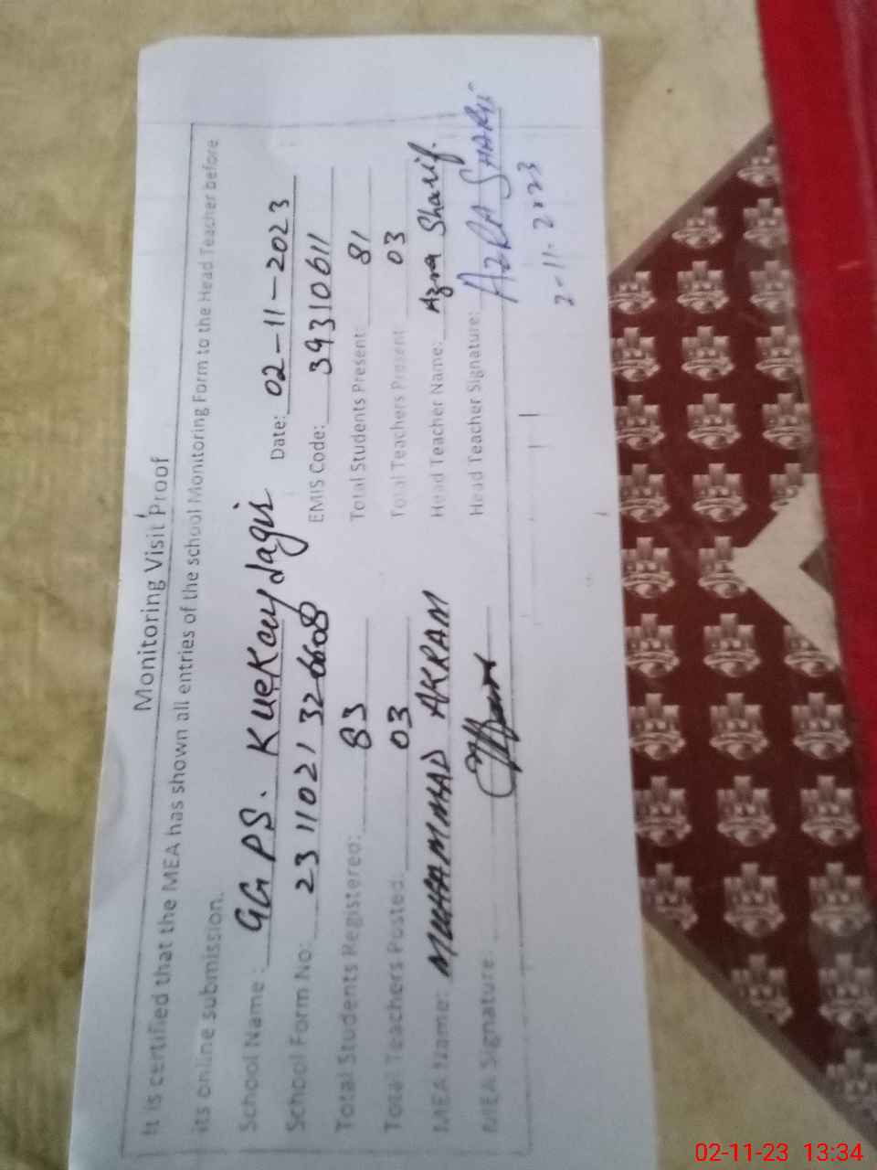 | Attendance Register | Head Teacher | MEA with School | Visit Proof |