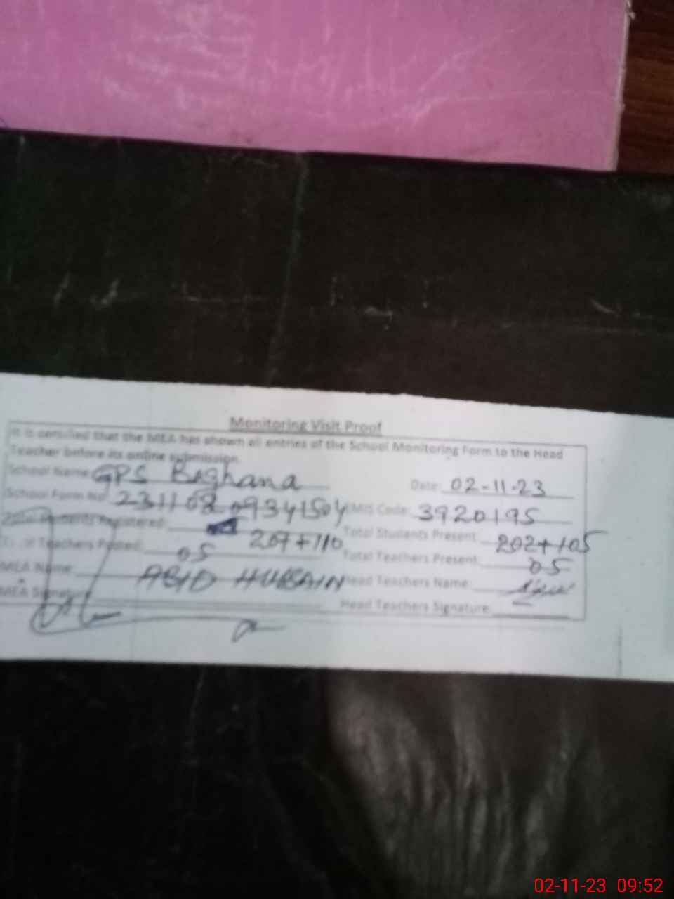 | Attendance Register | Head Teacher | MEA with School | Visit Proof |