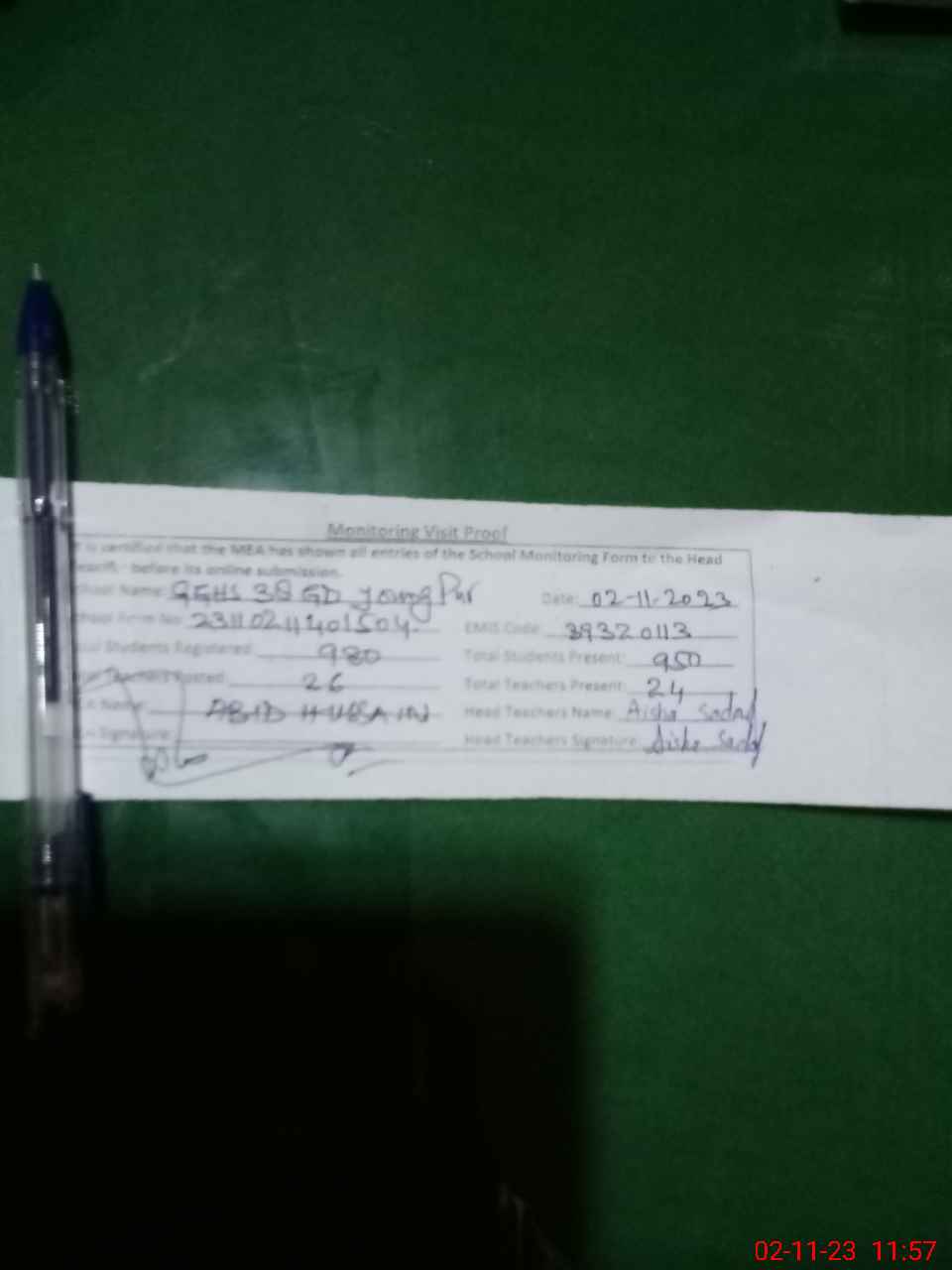 | Attendance Register | Head Teacher | MEA with School | Visit Proof |