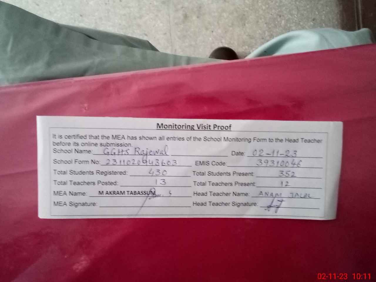 | Attendance Register | Head Teacher | MEA with School | Visit Proof |